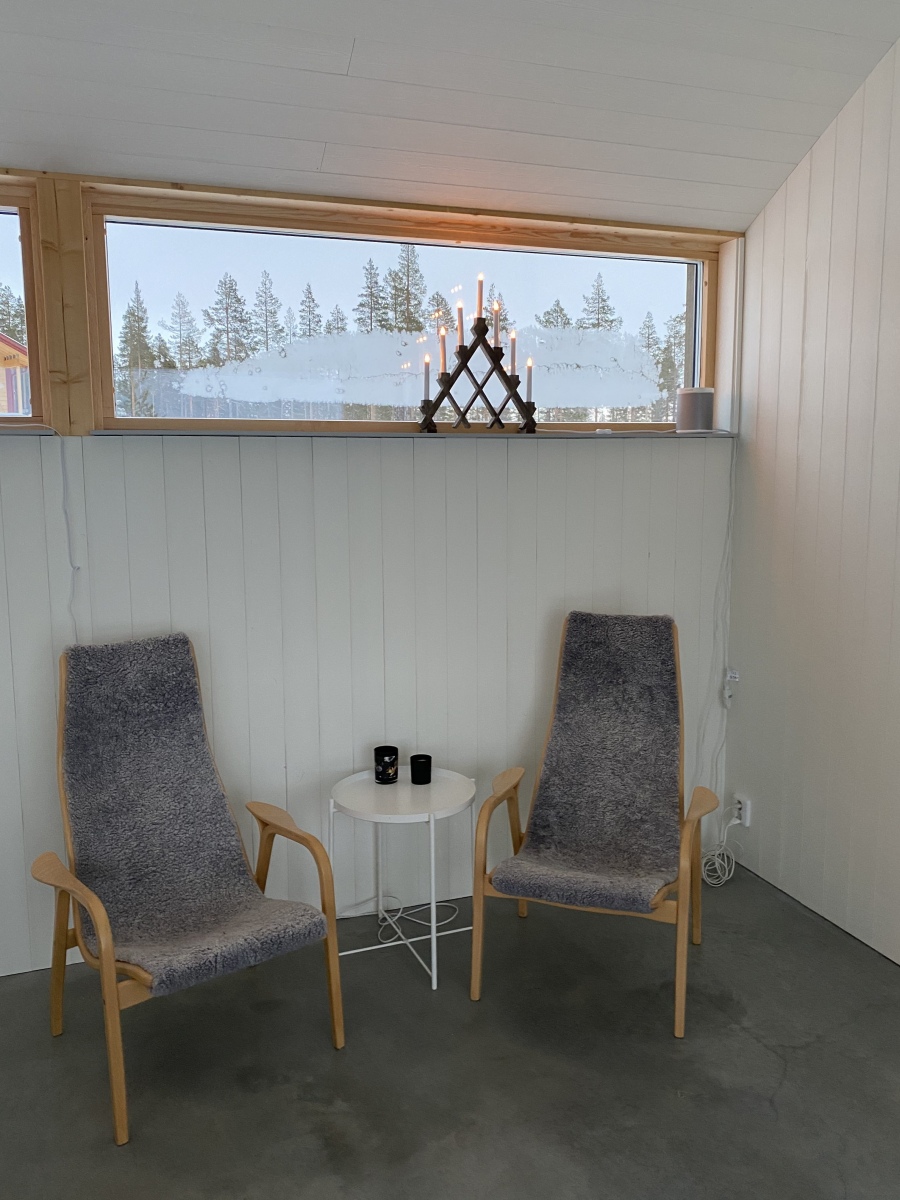 I kalldelen av huset finns en rymlig bastu med panoramutsikt. Här finns även ett litet omklädningsrum och en dusch.